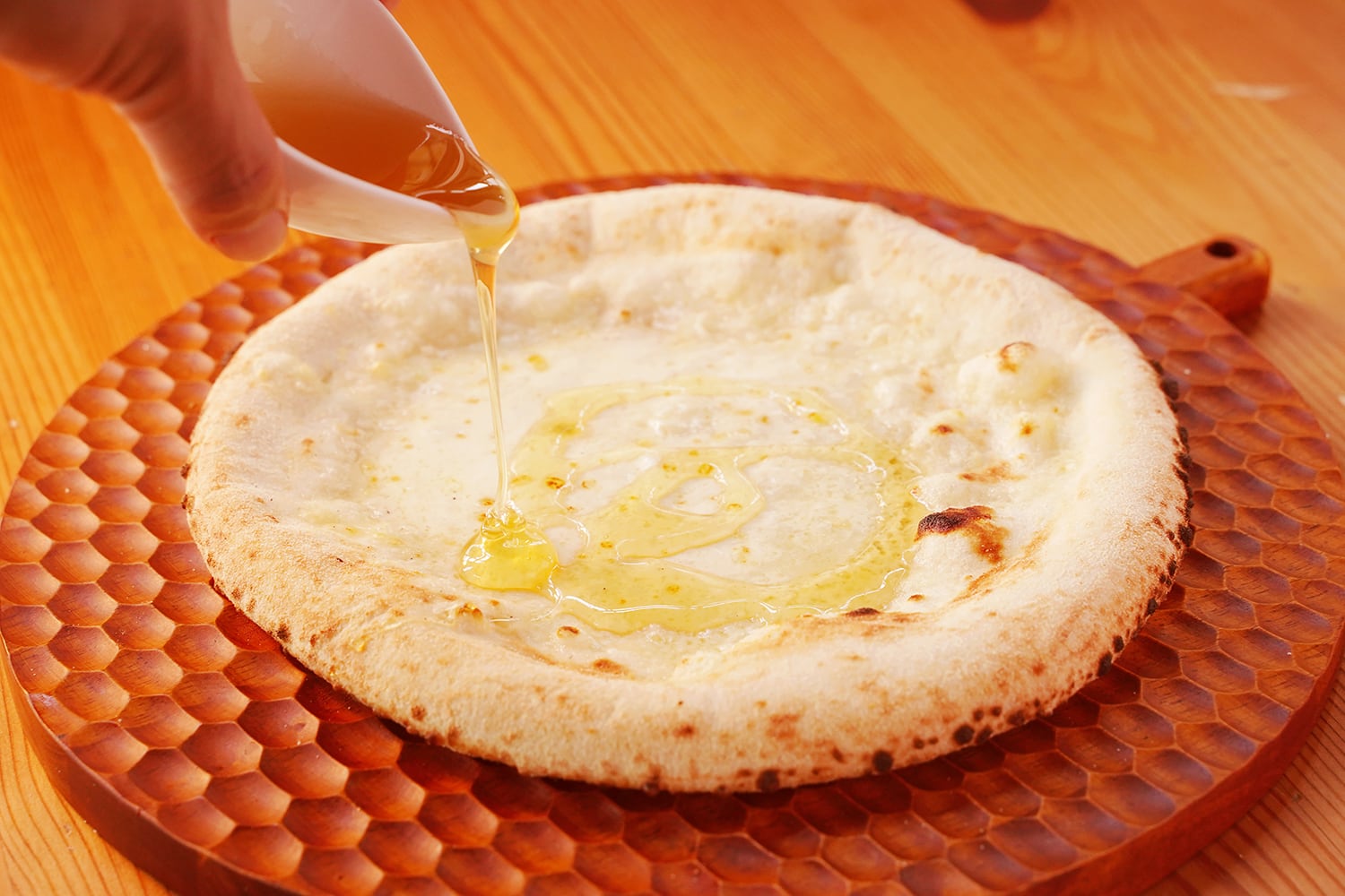 ピザ生地にクリームを染み込ませ、チーズを乗せたシンプルなピザに"はちみつ"をかけたスイーツピザです。