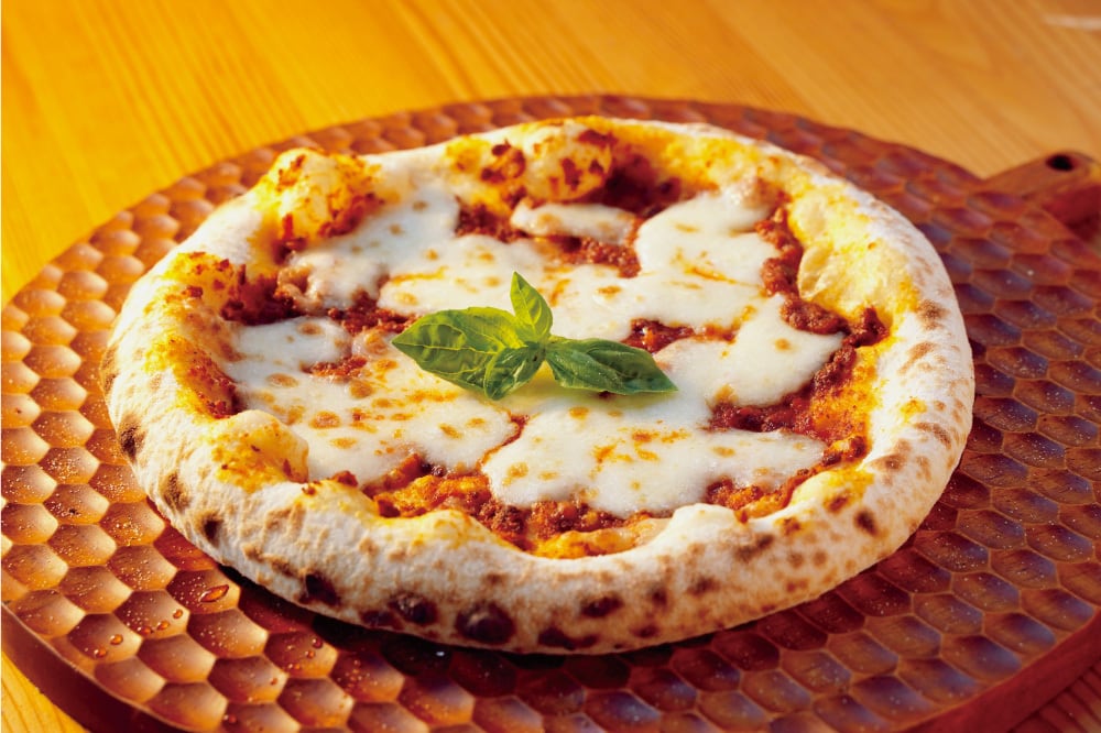 三重県産松阪牛100%の牛ひき肉を使用した、自家製ミートソースのピザに相性抜群のモッツァレラチーズを乗せたプレミアムピザです。